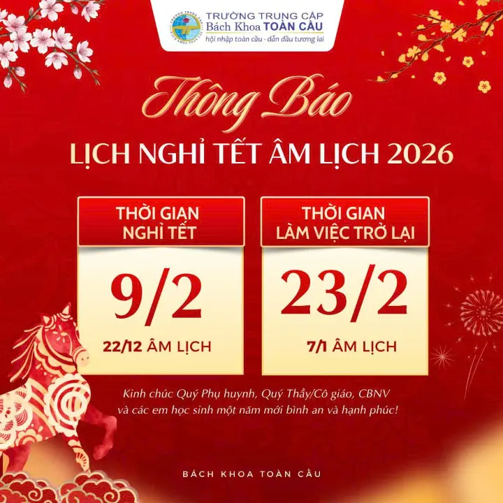 Trường Trung cấp Bách Khoa Toàn Cầu thông báo đến toàn thể Gián viên, Nhân viên lịch nghỉ Tết Âm lịch năm 2026
