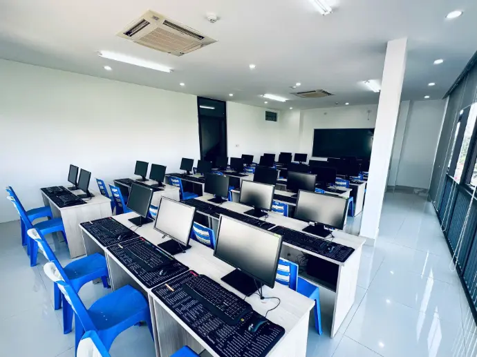 Hệ thống phòng máy tính được trang bị đầy đủ thiết bị, phục vụ hiệu quả cho các môn học ứng dụng công nghệ, tin học và quản lý.